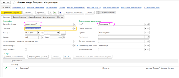 Бюджет IT, установим отборы по сценарию и ЦФО =