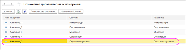 Далее необходимо в регистре «Назначение дополнительных измерений» (раздел «Настройки БИТ») назначить новую аналитику, чтобы можно было использовать ее в документах системы.
