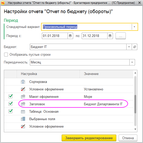 для этого Отчет по бюджету (обороты). В настройках отчета выберем Бюджет=