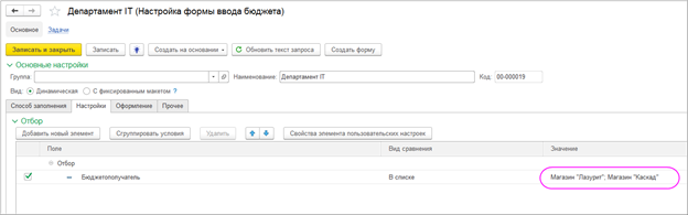 справочнике «Настройки форм ввода бюджета». В новой настройке заполним наименование, выберем Бюджет IT в поле «Бюджет», укажем